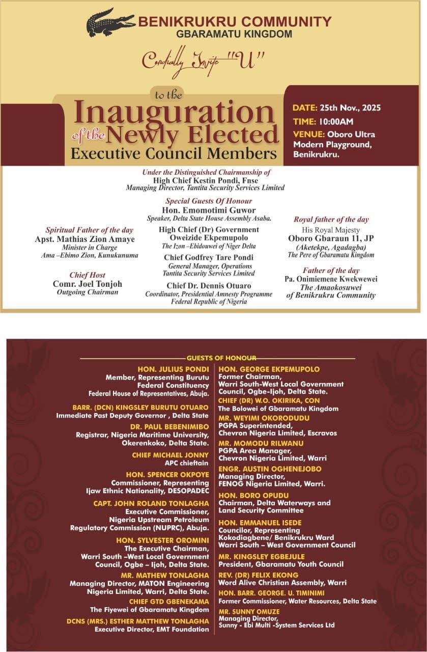 With the convergence of prominent figures in security, governance, traditional leadership, and regional empowerment, Tuesday’s inauguration promises to be a defining moment for Benikrukru. The event will not only unveil a new Executive Council but also symbolize renewed commitment to unity, progress, and community-driven development within Gbaramatu Kingdom.