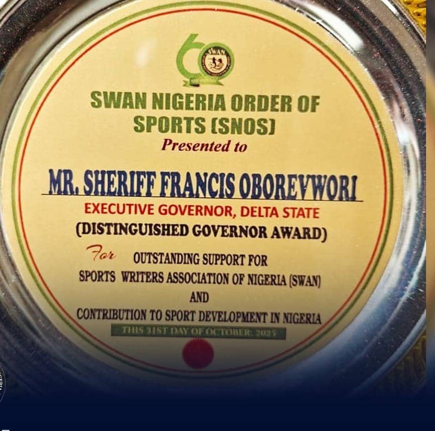 Delta State Governor, Rt. Hon. Sheriff Oborevwori, has been honoured with the Distinguished Governor Award and formally inducted into the Nigeria Order of Sports by the Sports Writers Association of Nigeria (SWAN) in recognition of his administration’s remarkable contributions to sports development and athlete welfare.