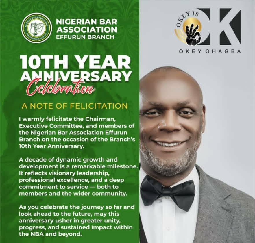 Former National Officer of the Nigerian Bar Association (NBA), Okey Leo Ohagba, has extended his warmest congratulations to the NBA Effurun Branch. This felicitation comes as the branch celebrates its landmark 10th anniversary.