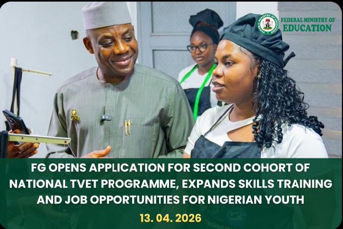 The Federal Ministry of Education has opened applications for the second cohort of Nigeria’s National Technical and Vocational Education and Training (TVET) Programme, beginning today at 4:00 p.m. (WAT), with the initiative aimed at advancing human capital development under President Bola Tinubu’s Renewed Hope Agenda.