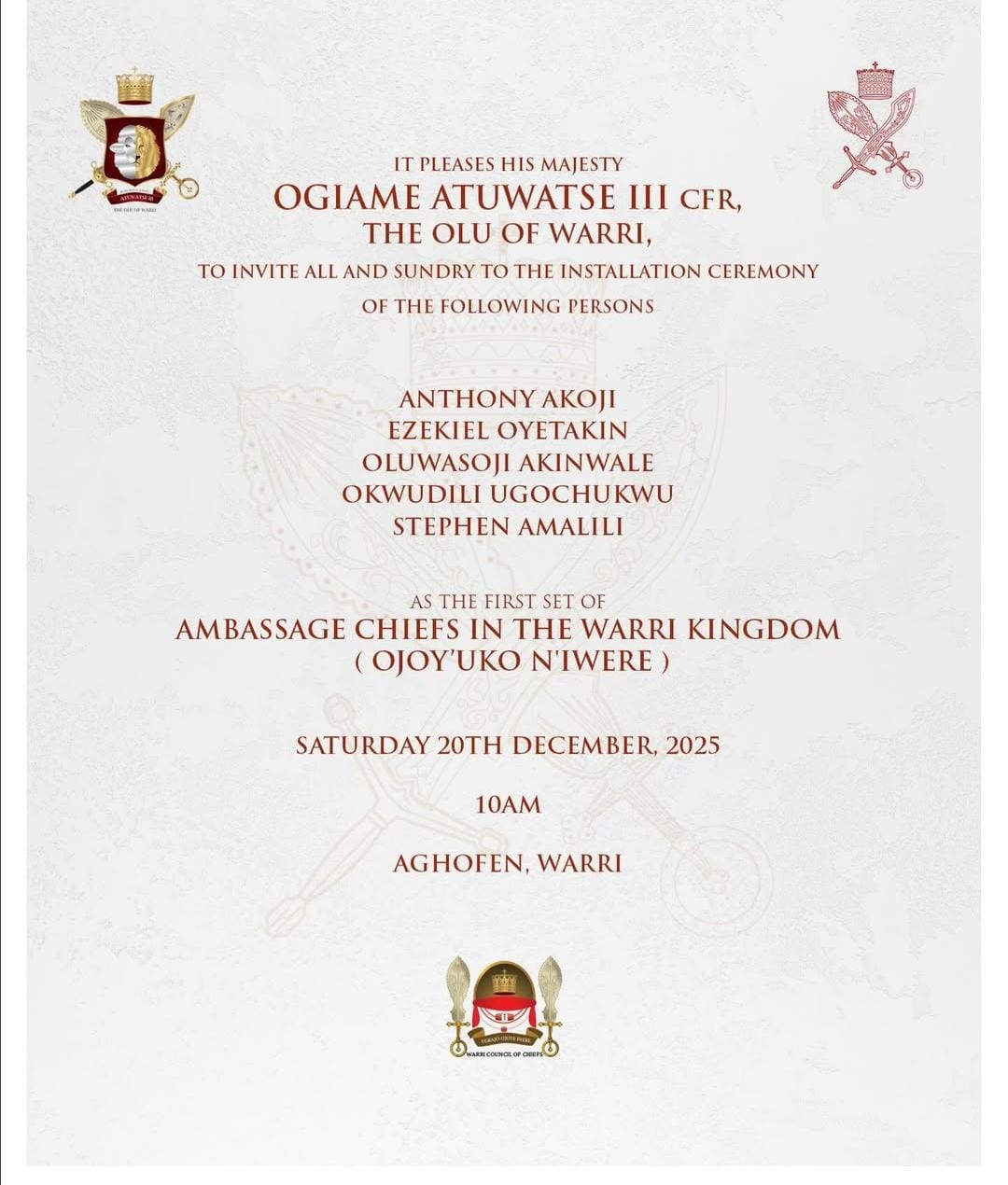 The Warri Kingdom has announced plans to confer Ambassage Chieftaincy titles on five notable non-Itsekiri indigenes as part of efforts to deepen inter-ethnic harmony, peaceful coexistence and cooperation among the diverse communities within the kingdom.